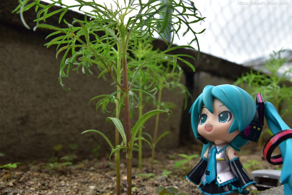 「コスモスさん、お花が咲くまで大きく育ってね♪」